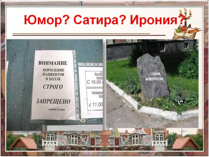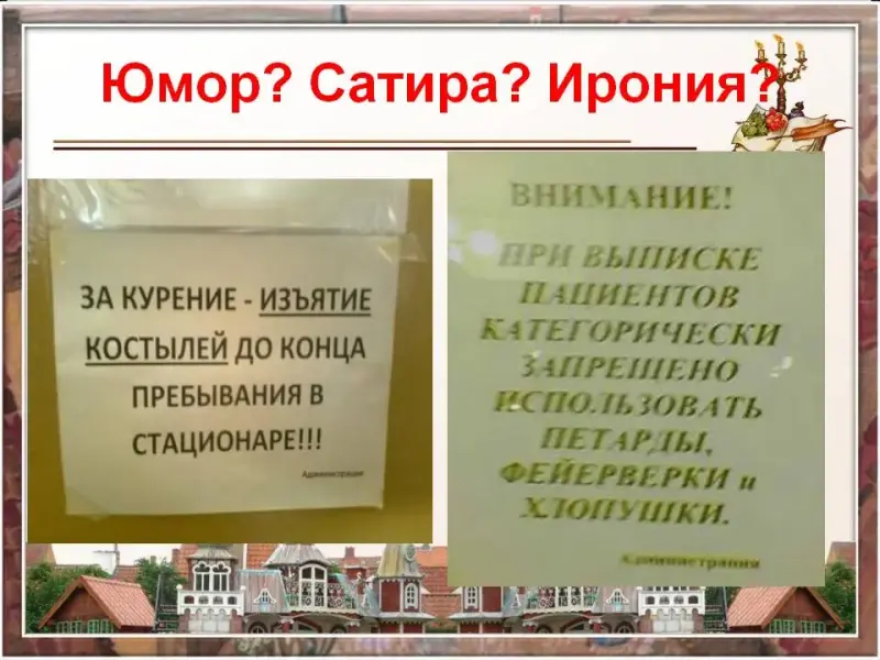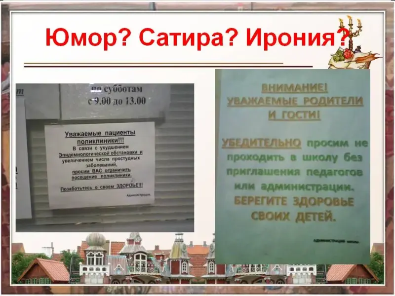 - А теперь предлагаю вам посмеяться. Обратите внимание на вывески и объявления, которые мы нашли в наше время. Думаю, М.М.Зощенко обязательно бы нашел повод ПОСМЕЯТЬСЯ! (Слайды 12-16).