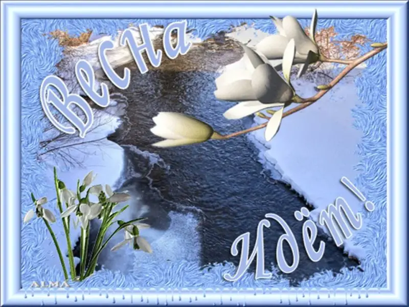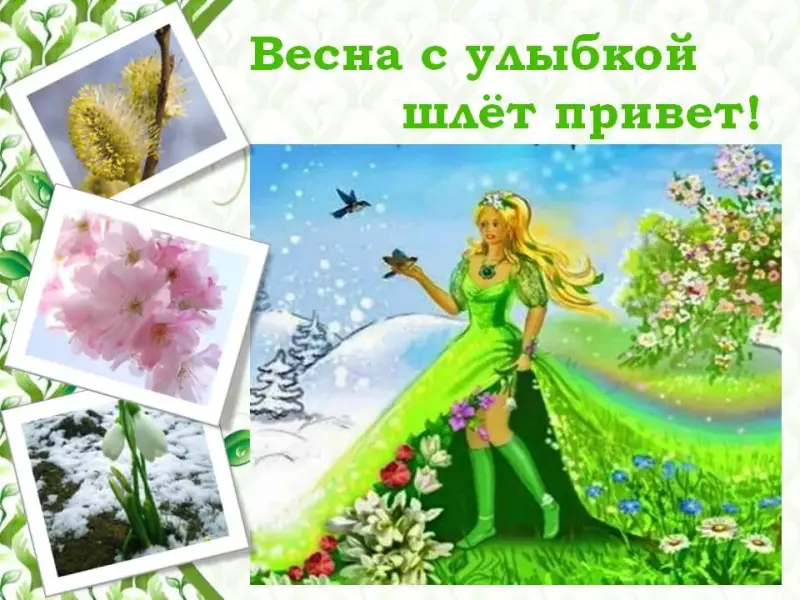 2 ученик: Весна - младшая из сестёр, самая весёлая и красивая. Любит слушать журчание ручьёв, звон капели, да соловьиные трели. Все наряды у неё зелёные, яркими цветами украшены. Никогда Весна не сердится, а только смеётся да людские сердца веселит.