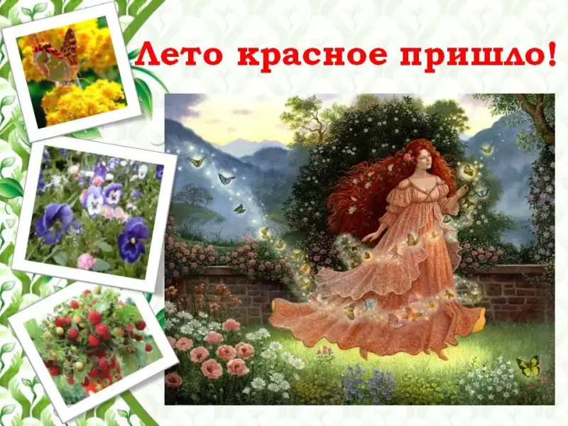 3 ученик: Сестрица Лето любит трудиться: в поле, в саду, в огороде, куда не глянь, везде её увидишь. С косарями Лето сено косит, с комбайнёрами на жатве трудится, с трактористами землю пашет, и с весёлой ребятнёй в речке плещется. Любит Лето зелёный наряд, украшенный спелыми плодами, шляпка у неё из спелых колосьев.