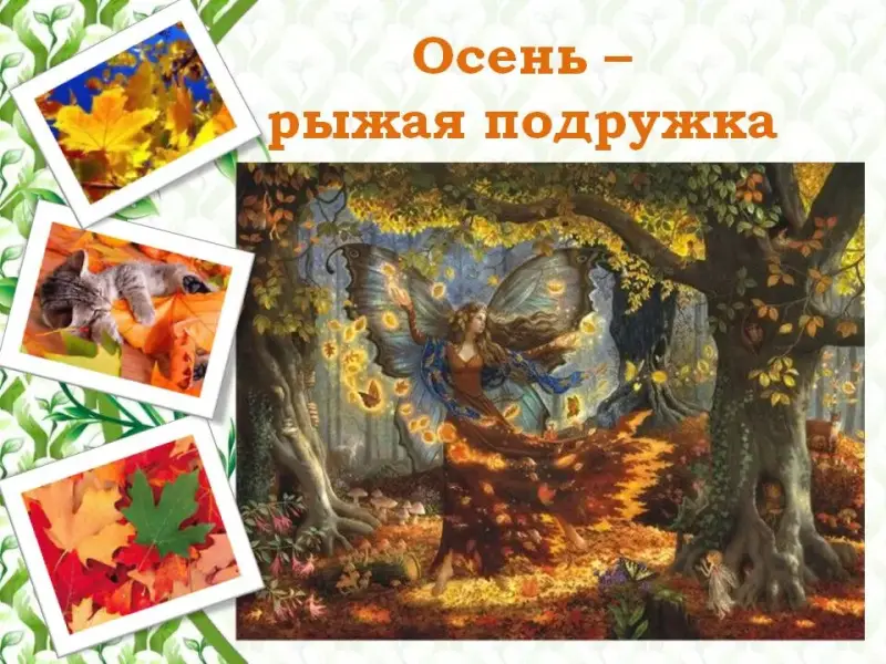 4 ученик: Сестрица Осень самая богатая из сестёр. Её закрома полны зерном, овощами и фруктами, соленьями и вареньем. Любит Осень яркие наряды, чтобы огнём горели да золотом блестели. Нарядится Осень, порадует людей красотой своего платья, а потом расплачется, в грязи измажется. Станет сыро и зябко. Умчится Осень в далёкие края, а на смену ей Зима придёт. Так и ходят, по земле, сменяя друг друга зима, весна, лето и осень.