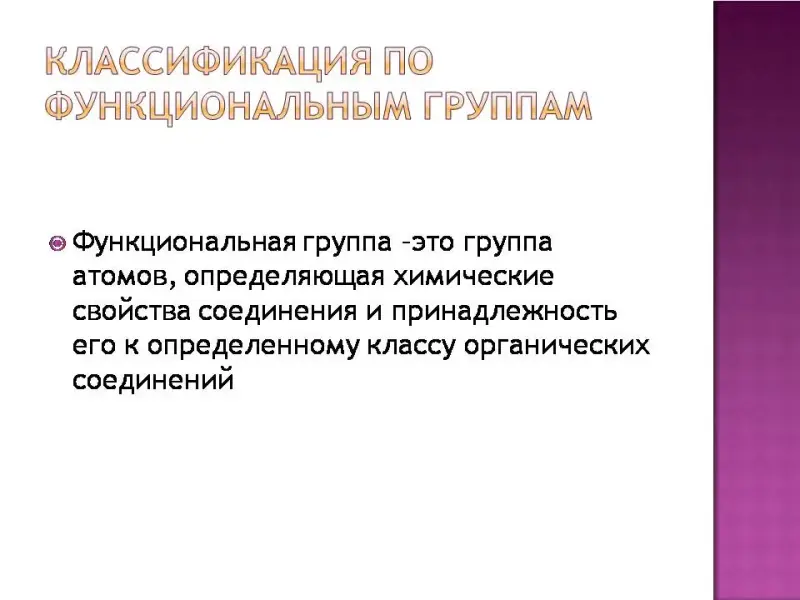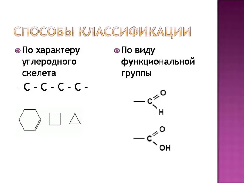 В природе существуют несколько миллионов органических соединений. Каждый год создаются все новые и новые органические вещества. Чтобы разобраться в огромном количестве органических соединений, необходимо их классифицировать. Существуют разные способы классификации органических соединений. Мы будем рассматривать два способа классификации: первый - по характеру углеродной цепи, второй - по функциональной группе. Слайд 2