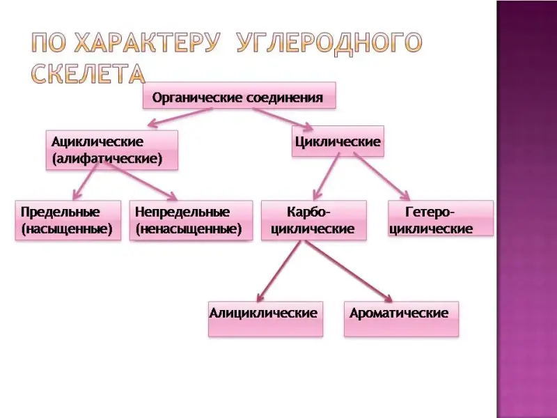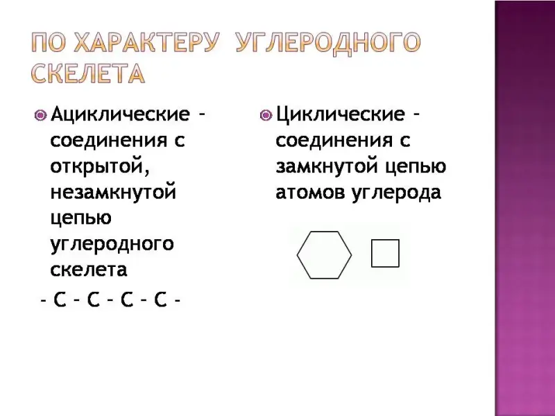 Последовательность химически связанных атомов углерода в молекуле составляет ее углеродный скелет. Это основа органического соединения. Поэтому первым признаком классификации органического соединения служит классификация по строению углеродного скелета. Слайд 3