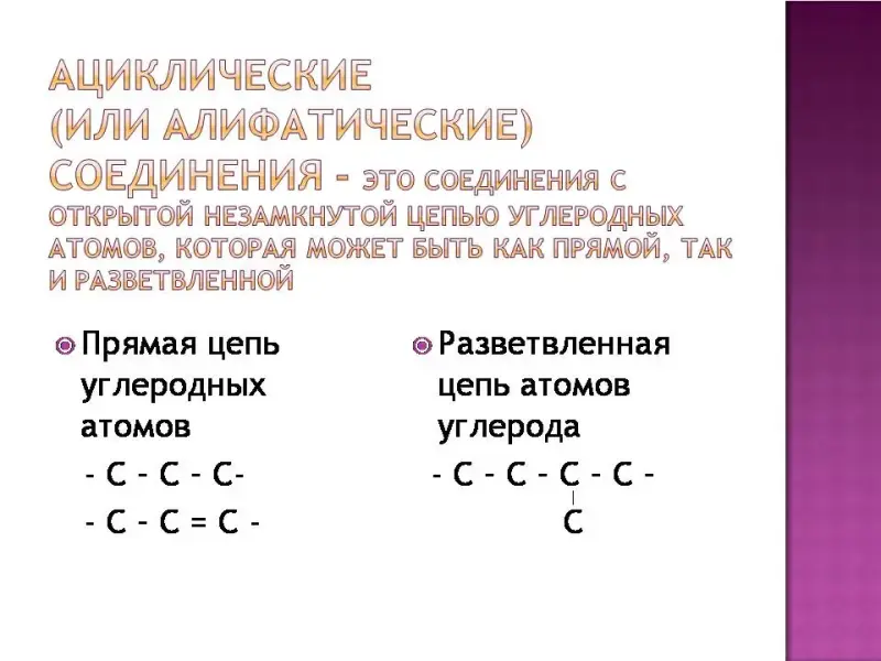 По характеру углеродного скелета органического соединения вещества можно разделить на открытые или ациклические (приставка а- обозначает отрицание, т.е. это незамкнутые цепи) и циклические в них углеродная цепь замкнута в цикл. Слайд 4
