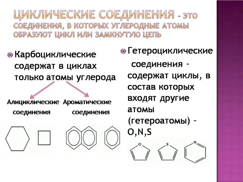 Циклические соединения - это соединения, в которых углеродные атомы образуют цикл или замкнутую цепь. Циклические соединения делятся на две большие группы: карбоциклические и гетероциклические. Карбоциклические содержат в циклах только атомы углерода и подразделяются на алициклические и ароматические. Гетероциклические соединения содержат циклы, в составе которых кроме атомов С входят один или несколько других атомов, так называемых гетероатомов ( греч. heteros - другой) - O, S, N. Слайд 7