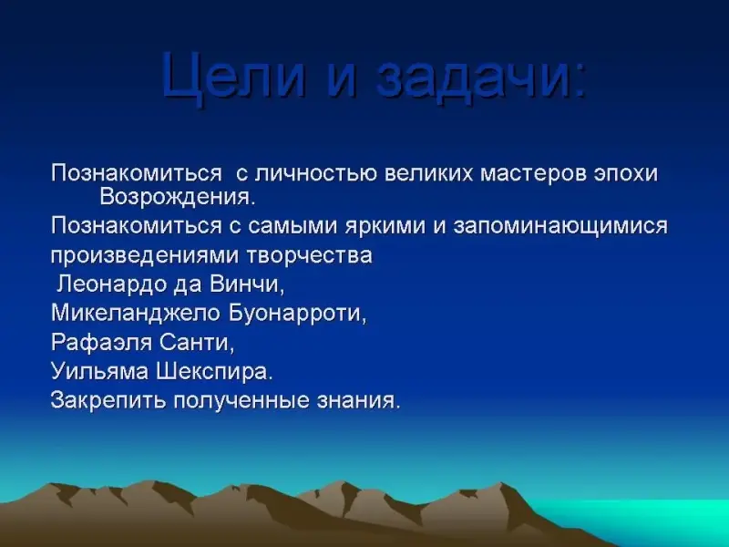 - Познакомить с яркими и запоминающимися творениями Леонардо да Винчи, Микеланджело Буонарроти, Рафаэля Санти, Уильяма Шекспира.