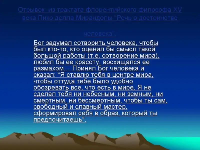 1. Перед нами отрывок из трактата флорентийского философа XV века Пикоделла Мирандолы " Речь о достоинстве человека". Попробуем осмыслить и прокомментировать его.