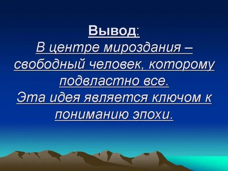 Вывод: В центре мироздания - свободный человек, которому подвластно все. Эта идея является ключом к пониманию эпохи.