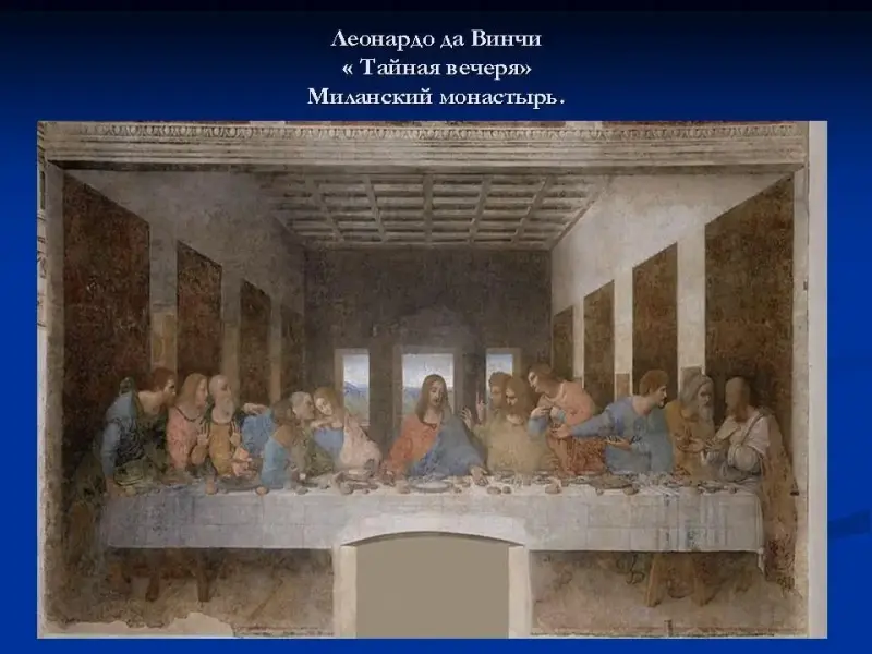 Леонардо изобразил тот момент из " Евангелия", когда Христос, вероятно, произнес пророческие слова: " Один из вас предаст меня"- и ученики вопрошают: "Не я ли, Господи?".