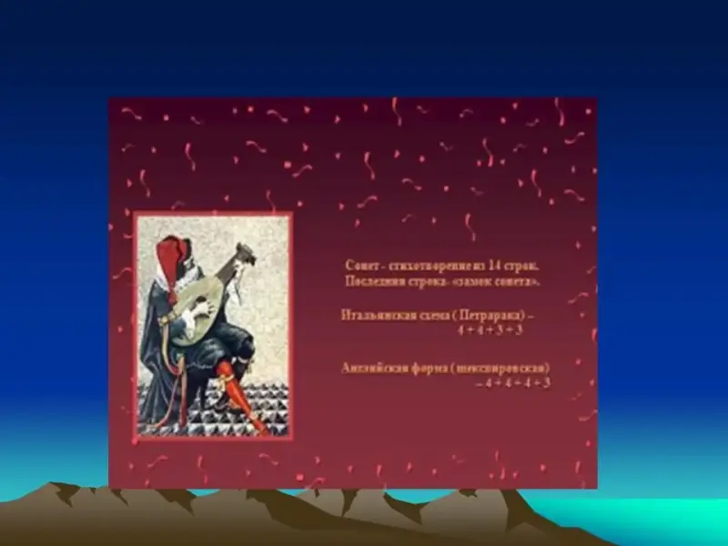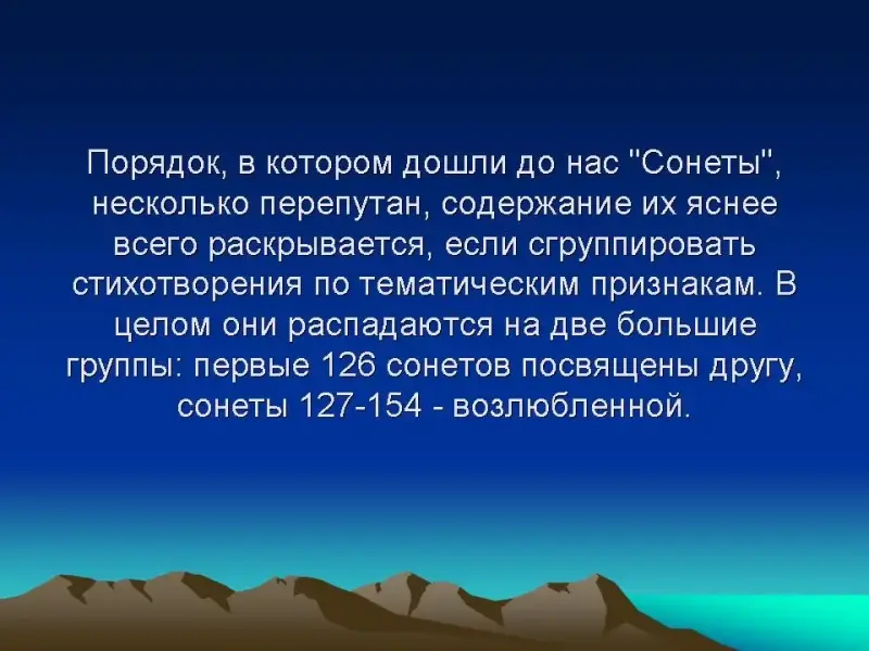 4. СОНЕТ? Учитель зачитывает отрывки из произведений Шекспира ("Ромео и Джульетта", сонеты). Учащиеся определяют, где отрывок из сонета и обосновывают свое мнение. после этого задания можно прейти к переводам сонетов Шекспира.