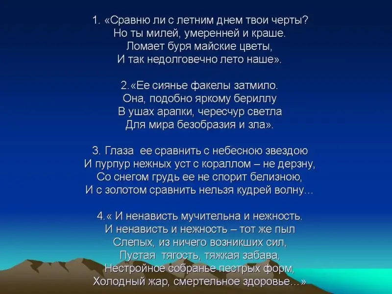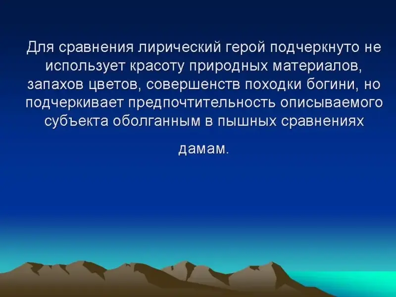 Для сравнения лирический герой подчеркнуто не использует красоту природных материалов, запахов цветов, совершенств походки богини, но подчеркивает предпочтительность описываемого субъекта оболганным в пышных сравнениях дамам. 130