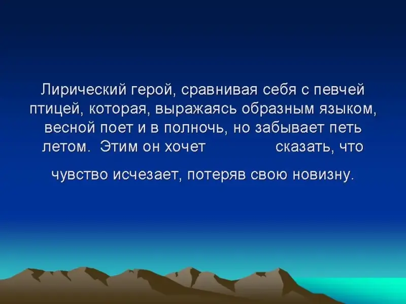 Лирический герой, сравнивая себя с певчей птицей, которая, выражаясь образным языком, весной поет и в полночь, но забывает петь летом. Этим он хочет сказать, что чувство исчезает, потеряв свою новизну. 102