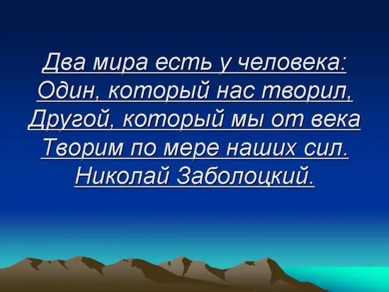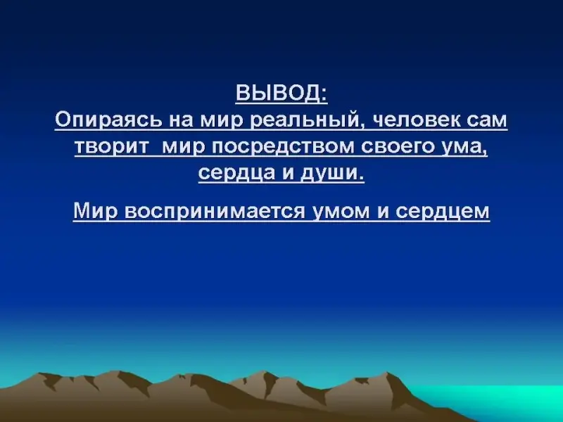 ВЫВОД: Опираясь на мир реальный, человек сам творит свой мир посредством своего ума, фантазии. Мир воспринимается умом и сердцем.