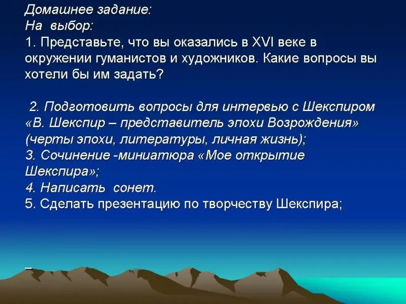 - Сделать презентацию по творчеству Шекспира. подготовить вопросы для интервью с Шекспиром "В. Шекспир - представитель эпохи Возрождения" (черты эпохи, литературы, личная жизнь);