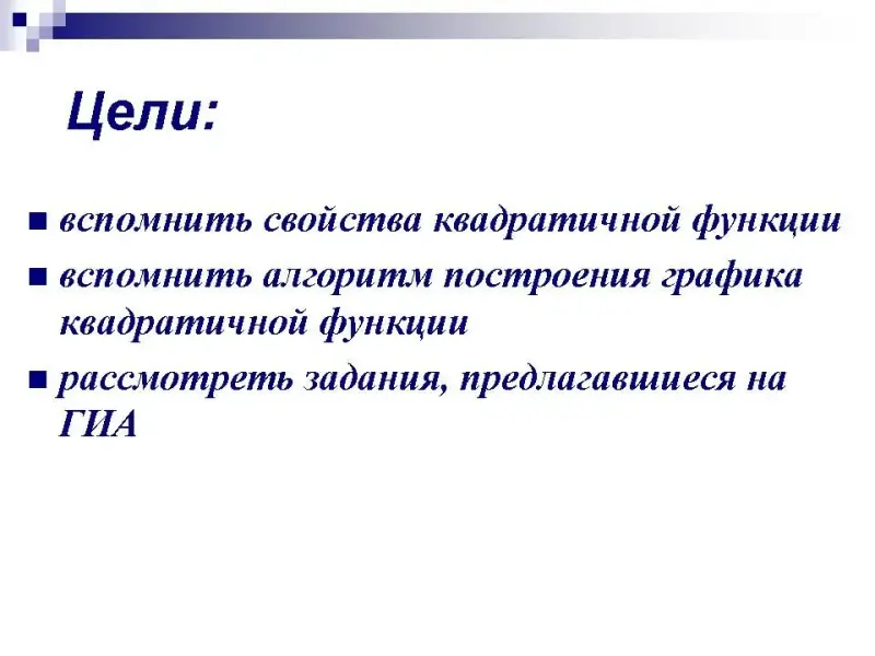 - oбразовательные: в ходе урока обеспечить повторение и систематизацию следующих знаний и умений - определение квадратичной функции, свойства квадратичной функции, алгоритм построения графика квадратичной функции;