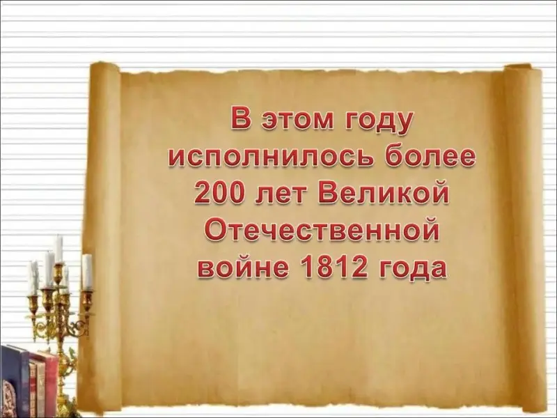 Слайд 2: "В этом году исполнилось более 200 лет Великой Отечественной войне 1812 года".