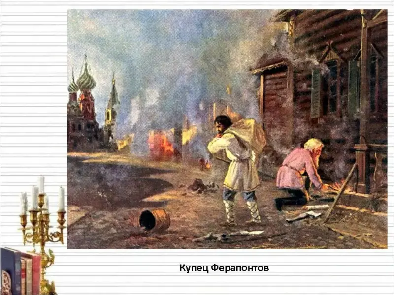 Ферапонтов при приближении французов к Можайску поджигает свою лавку и кричит отчаянно: "Тащи всё, ребята! Решилась Расея! Сам запалю!" - и он уничтожает всё кровно нажитое, лишь бы оно не досталось врагу.