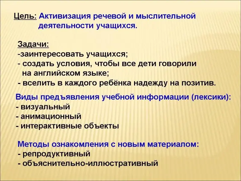 Современные информационно-коммуникационные технологии позволяют сделать этот этап урока не только интересным, но и продуктивным с точки зрения активизации мыслительной и речевой деятельности учащихся. Использую разные виды предъявления учебной информации, в данном случае лексики: визуальный (зрительная память помогает лучше запомнить слова), анимацию, интерактивные объекты. Для приобретения учащимися навыков устной речи, а также для достижения второго уровня усвоения знаний следует организовать деятельность школьников по неоднократному воспроизведению сообщённых им слов и выражений, что является одним из основных признаков репродуктивного метода. Метод этот предполагает организующую, побуждающую деятельность учителя и творческую, мыслительную деятельность учащихся.