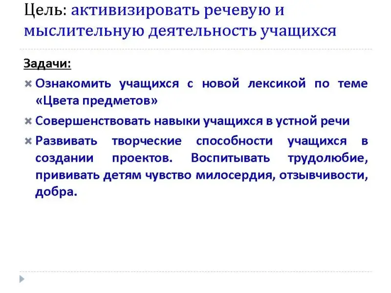 - Третий этап: цветы под номерами разбросаны в другом порядке, сверху - слова, обозначающие цвет, без номеров. Учащиеся должны назвать цвет указанного учителем предмета, стрелочка подтверждает или опровергает правильность ответа.