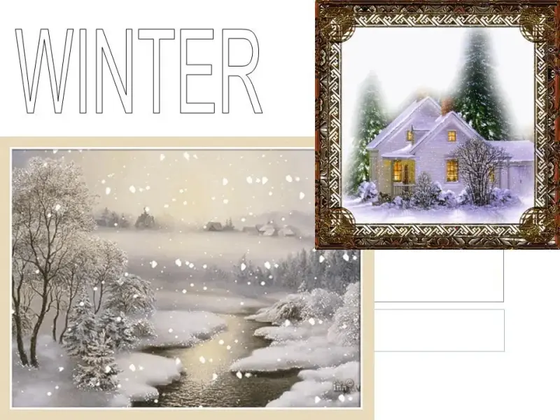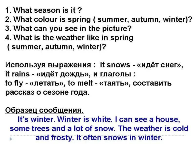 Образец сообщения. It's winter. Winter is white. I can see a house, some trees and a lot of snow. The weather is cold and frosty. It often snows in winter.
