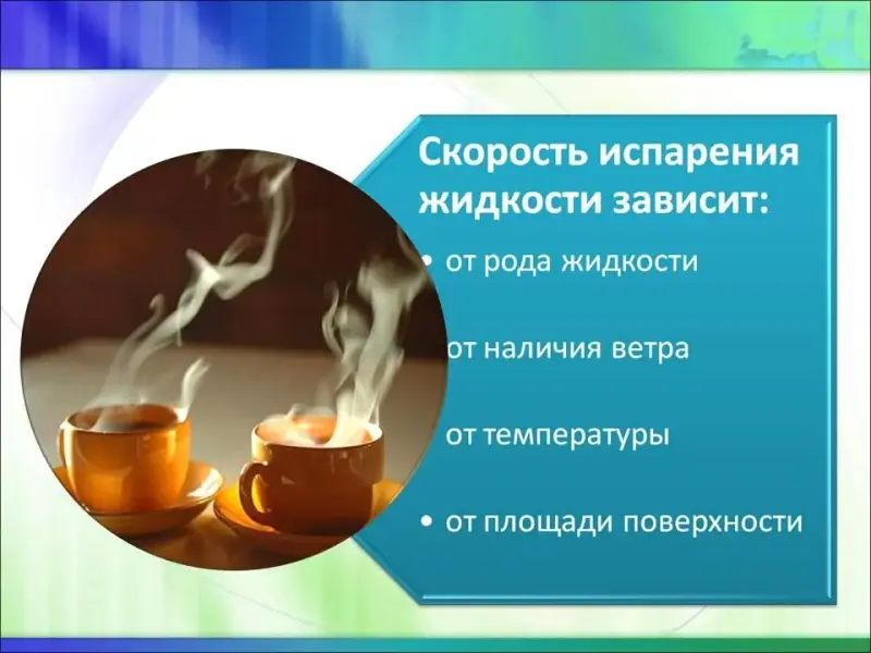 Учитель: Неравномерное распределение кинетической энергии теплового движения молекул приводит к тому, что при любой температуре кинетическая энергия некоторых молекул жидкости или твердого тела может превышать потенциальную энергию их связи с остальными молекулами. В результате с поверхности жидкости или твердого тела вылетают молекулы, кинетическая энергия которых превышает потенциальную энергию взаимодействия молекул. Происходит парообразование. Существует два способа парообразования. Назовите их.