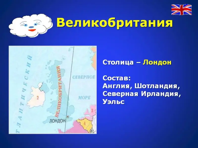 - С высоты тучка увидела страну на островах. Столица этой страны - Лондон, а её жители называют себя англичанами.