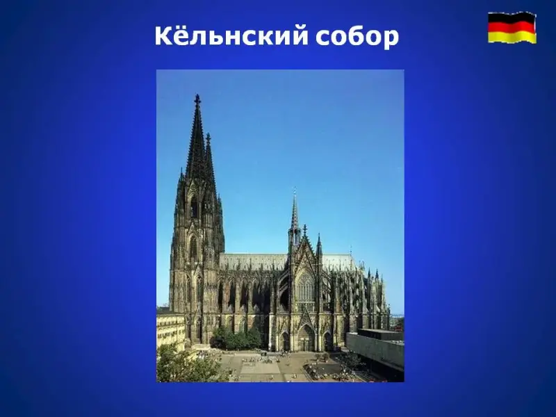 Дополнительный материал для учителя.9 мая мы будем отмечать очередную годовщину Победы над фашистской Германией. Во время Великой Отечественной войны, бомбардировками был уничтожен практически весь город Кёльн, не пострадал только Кёльнский собор. Оказалось, что по негласному сговору лётчиков, собор берегли как географический ориентир, ведь его высота 157 метров. Кёльнскому собору скоро исполнится 800 лет. Сейчас он занимает 3 место в списке самых высоких церквей мира.