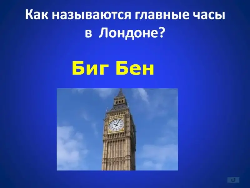 - Как называются главные часы в Лондоне? (Биг-Бен)