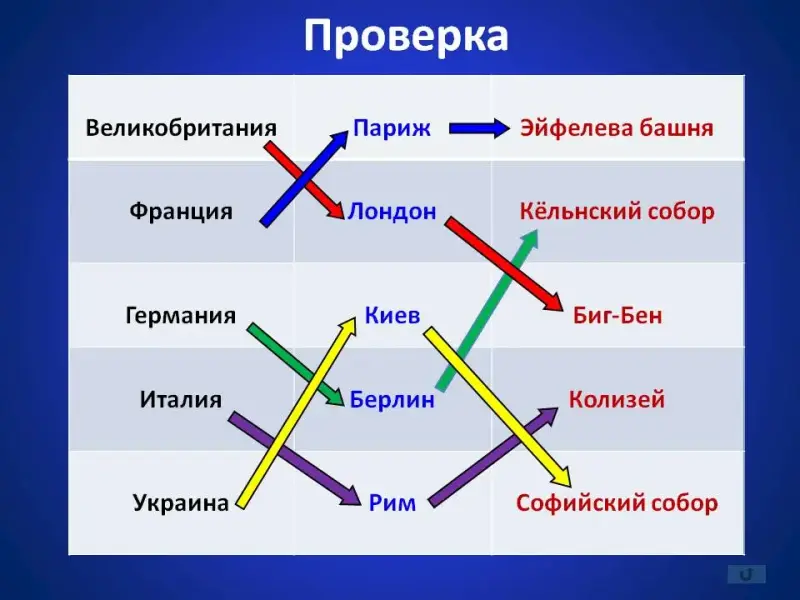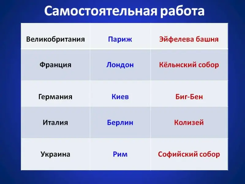 - Возьмите карточку для проверочной работы. На карточке в 1-ом столбце написаны названия государств, во 2-ом столбце названия столиц, в 3-ем - достопримечательности этих государств. Проведите линии и соедините название страны со столицей этого государства и достопримечательностью. (Слайд 46)