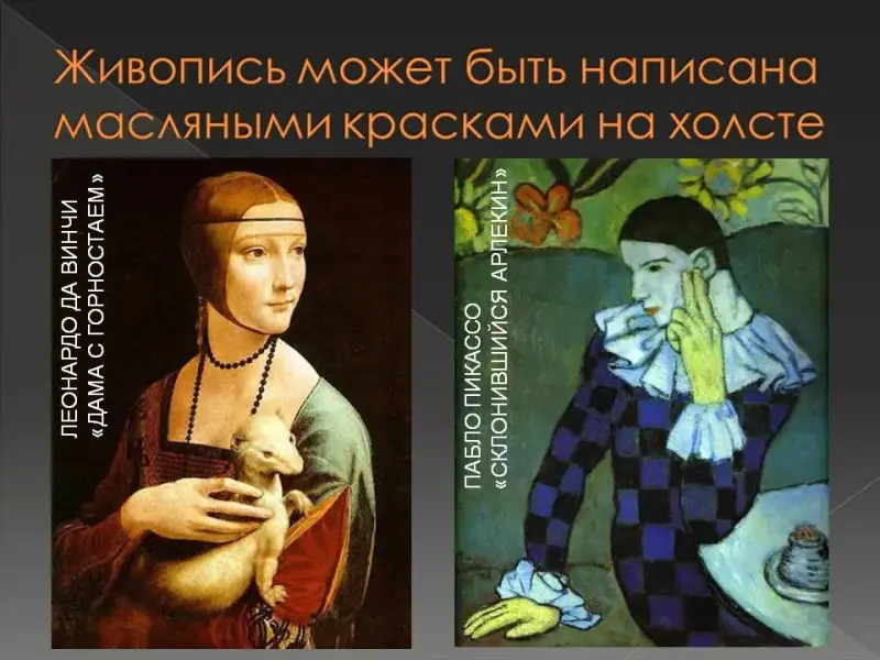 Слайды 17, 18, 19, 20 В художественных произведениях, создаваемых живописью, используются цвет и рисунок, светотень, выразительность мазков, фактуры и композиции, что позволяет воспроизводить на плоскости красочное богатство мира, объёмность предметов, их качественное, материальное своеобразие, пространственную глубину и световоздушную среду. Живопись может быть исполнена масляными красками, темперой, акриловыми красками и акварелью.[7]
