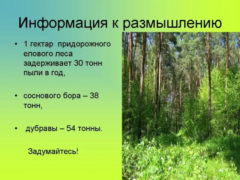 1 гектар придорожного елового леса задерживает 30 тонн пыли в год, соснового бора - 38 тонн, а дубравы - 54 тонны. Задумайтесь!