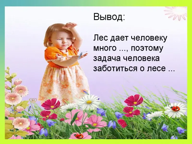 Слайд № 28 ) Верно. Лес это-место отдыха для человека, аптека - лекарственные растения, источник чистой воды и пищи, источник топлива, источник древесины, дом для растений, животных, грибов, защитник воздуха, водоёмов, почв, красота. Значение леса в жизни человека велико. Мы не должны забывать, что мы часть природы. Однако человек часто, пользуются дарами природы и приносит ей вред, создавая проблемы.