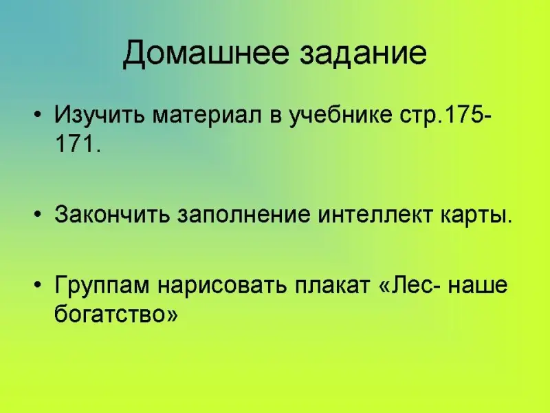 (Слайд №4) - Предоставляется слово по теме: «Лес - природное сообщество нашего края» первой группе. Выступление с презентацией подготовили Зеленов Н. и Юрова М. остальные внимательно слушают, заполняют интеллект-карту на основе услышанного. Обратите внимание при заполнении карты, вам необходимо делать записи только в рамочках зеленого цвета.