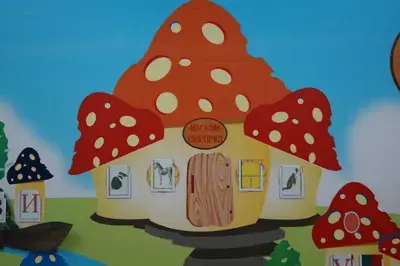 Игра "Поезд". Дети строятся в колонну, кладут руки на плечи друг друга и имитируют движения поезда. Перемещаются по группе и подходят к панно "Деревня буквиков". (Рисунок 1)
