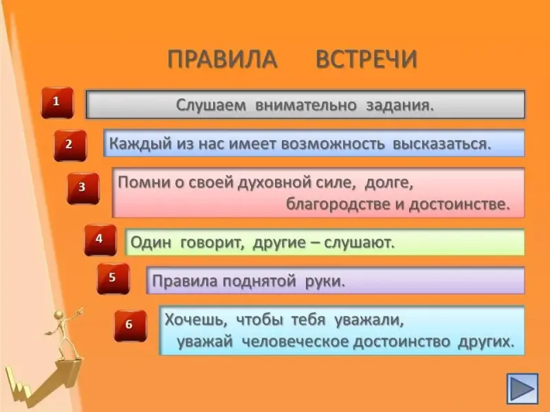 - Чтобы занятие было продуктивным нам необходимо определить правила встречи.