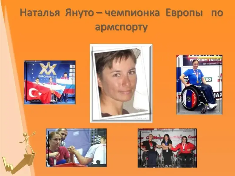 Наталья Януто. Можно позавидовать её стойкости и воле. Она родилась и живёт в посёлке Белозёрском Московской области. После несчастного случая девочка, прикованная к постели, сжала кулаки и стала биться за своё право быть счастливой. Сначала увлеклась бисероплетением, а спустя несколько лет на Чемпионате Европы дважды поднялась на самую высокую ступеньку пьедестала по армспорту. Она плакала от бессилия, болей, равнодушия окружающих. Но жизненные трудности лишь закалили её характер. Она завоёвывала золотые, серебряные, бронзовые медали в упорной борьбе. И перед чемпионатом Европы она твёрдо решила: не уступлю. Днём и ночью она качала бицепсы, доставая гирю из под своей подушки. Наташа соревновалась с титулованными спортсменами, но сумела всем доказать, что если есть желание и упорство, то можно добиться всего. Она победила. Две золотые медали, два хрустальных кубка, два диплома и звание Чемпионки Европы по армспорту.