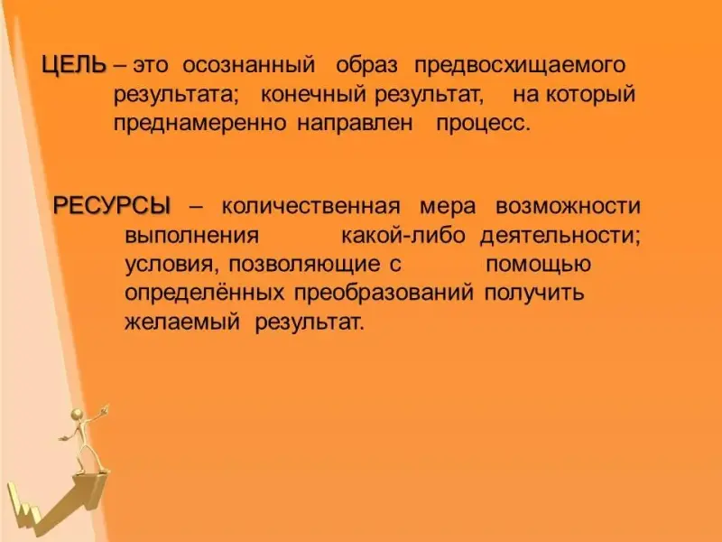 - Цель - это осознанный образ предвосхищаемого результата. Многие люди терпят неудачи в жизни, т.к. не имеют хорошо продуманных целей.