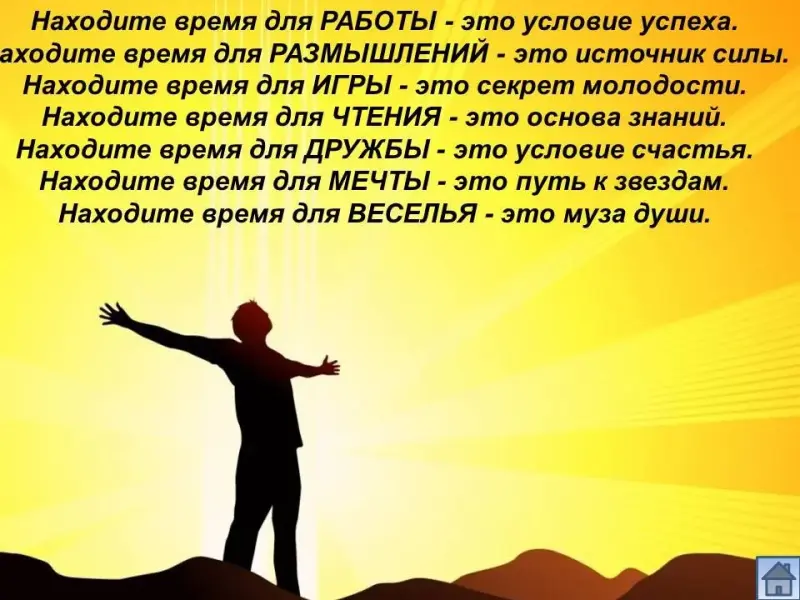- Цените время! Берегите время! Помните, что "тот, кто позволяет ускользать своему времени, выпускает из рук свою жизнь, тот, кто держит в руках свое время, держит в руках свою жизнь" (Алан Лэкейн).