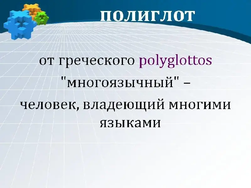 Согласно академическому словарю иностранных слов, ПОЛИГЛОТ (от греческого polyglottos - "многоязычный") - человек, владеющий многими языками.