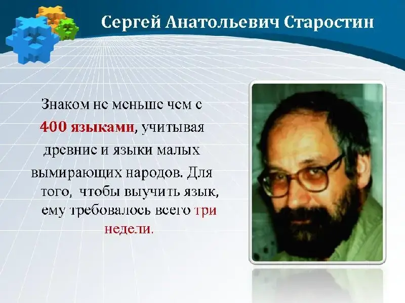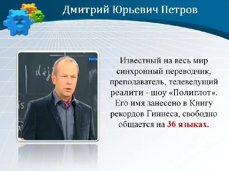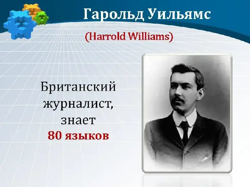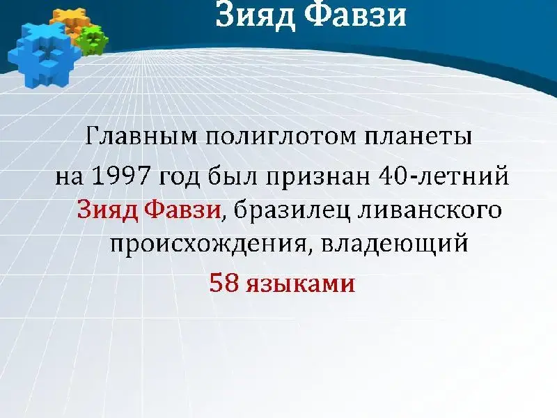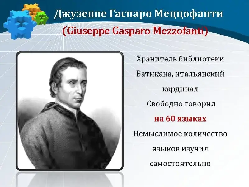 Учитель 1: Нас удивляют факты, что тот или иной человек знает в совершенстве 3 - 5 языков. Но это, оказывается, не предел. Послушайте сообщение о великих полиглотах планеты.