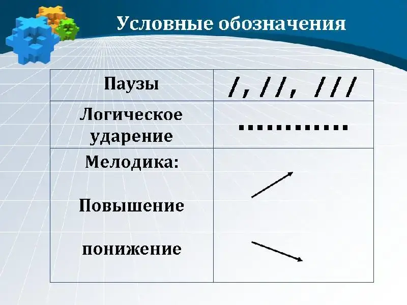 Давайте вспомним, какими значками обозначаются элементы интонации: пауза, логическое ударение и мелодика (Приложение 20).