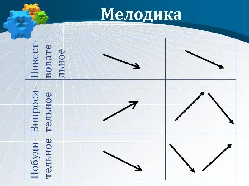 Проверим. Какая же мелодика в повествовательных предложениях? (Нисходящий тон). В побудительных предложения? (нисходящий тон). А какая же мелодика в вопросительных предложениях? Подумайте (восходящий тон)