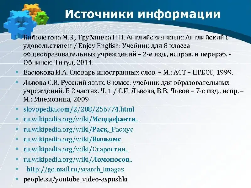 - Биболетова М.З., Трубанева Н.Н. Английския язык: Английский с удовольствием / Enjoy English: Учебник для 8 класса общеобразовательных учреждений - 2-е изд., исправ. и перераб. - Обнинск: Титул, 2014.