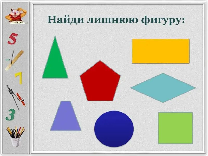 - Среди геометрических фигур найдите лишнюю? (слайд 8) - Объясните свой ответ? - Дайте общее название оставшимся фигурам? - По какому признаку можно разбить их на группы? - Найдите фигуры с наименьшим количеством углов? - Найдите фигуры с наибольшим количеством углов? - Какое наибольшее количество углов может иметь фигура? - Какие фигуры остались? |