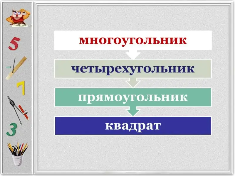 Многоугольник, четырехугольник, прямоугольник, квадрат. |
