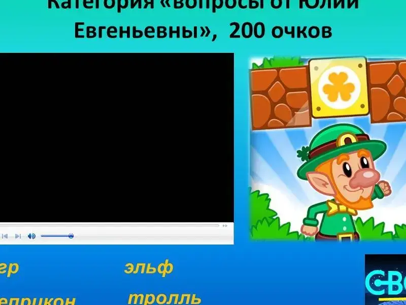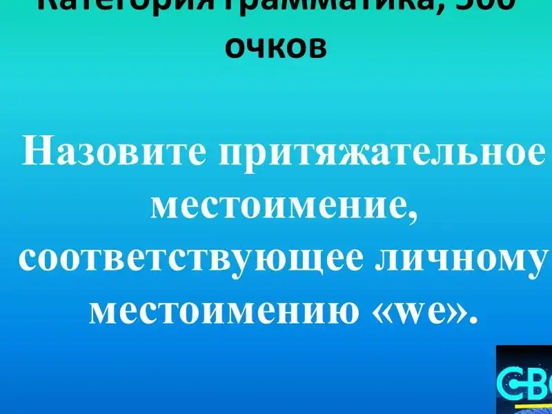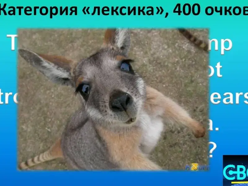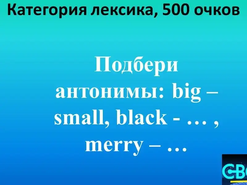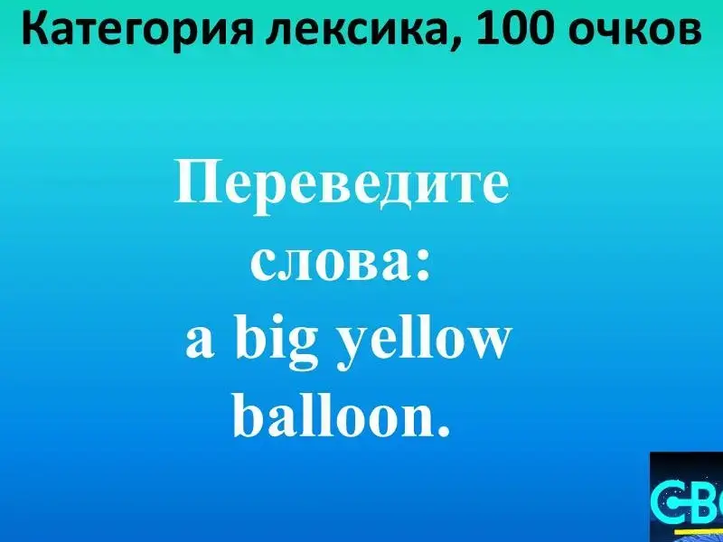 Вопросы 1 раунда. 1. Грамматика 100. 2. Грамматика 200 - страус - an ostrich 3. Грамматика 300. Форма глагола - are. 4. Грамматика 400. Am, is, are 5. Грамматика 500. Местоимение "мы". 6. Лексика 100. Большой жёлтый шарик. 7. Лексика 200. Медведь, слон, крокодил, апельсин, обезьяна. 8. Лексика 300. Жёлтый, один, красный, оранжевый, три, десять, чёрный, серый, семь, двадцать. 9. Лексика 400.Молоко, сок, кофе. 10. Лексика 500. black (чёрный) -..., merry (весёлый) - ... . 11. Вопросы от...100. Посмотрите внимательно на картинку и скажите: кто эта известная леди? 12. Вопросы от ...200. На картинке вы видите известного британского персонажа. Кто это? Огр, эльф, леприкон, тролль. 13. Вопросы от...300. Посмотрите внимательно на картинку. Сколько оленей в упряжке Санты? 14. Вопросы от...400. Зимой и летом одним цветом. 15. Вопросы от...500. Посмотрите на гвардейца королевы. Из меха, какого животного изготовлен его головной убор? |