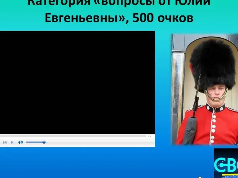 Questions of the first round: 1. Grammar 100. При помощи каких суффиксов образуется множественное число имён существительных? 2. Grammar 200.Назовите артикль, который должен использоваться со словом:...ostrich 3. Grammar 300. Какая форма глагола to be используется с местоимениями you, we, they в настоящем времени? 4. Grammar 400. Назовите 3 формы глагола "to be" в настоящем времени. 5. Grammar 500. Назовите притяжательное местоимение, соответствующее личному местоимению "we". 6. Lexis 100. Переведите слова: а big yellow balloon. 7. Lexis 200. Назовите лишнее слово: a bear, a wolf, an elephant, a crocodile, an orange, a monkey. 8. Lexis 300. "Кот в мешке" - "а pig in a poke". На какие группы можно разделить слова: yellow, one, red, orange, three, ten, black, grey, seven, twenty 9. Lexis 400. Продолжите ряд: milk, juice, coffee... 10. Lexis 500. Подберите антонимы: big - small, black - ... , merry - ... 11. Questions from...100. Look carefully at the picture and say: Who is this famous lady? 12. Questions from ...200. At the picture you can see a famous British fairy character. Who is it? An ogre, an elf, a leprechaun, a troll. Questions from ...300. Look at the picture very carefully. How many reindeer has Santa got? Questions from ...400. What tree has the same colour in winter and in summer? Questions from ...500. Look at the Queen's Guard. What fur his cap is made of? |