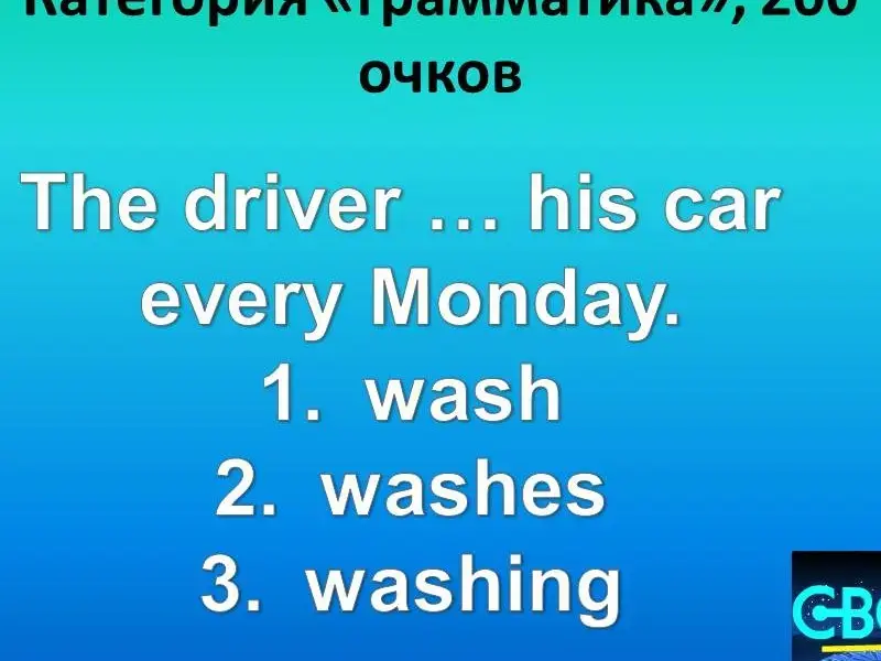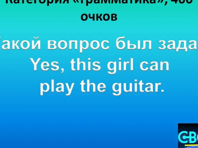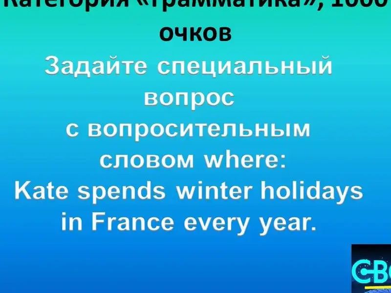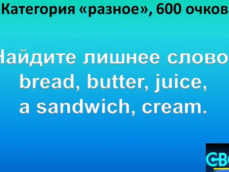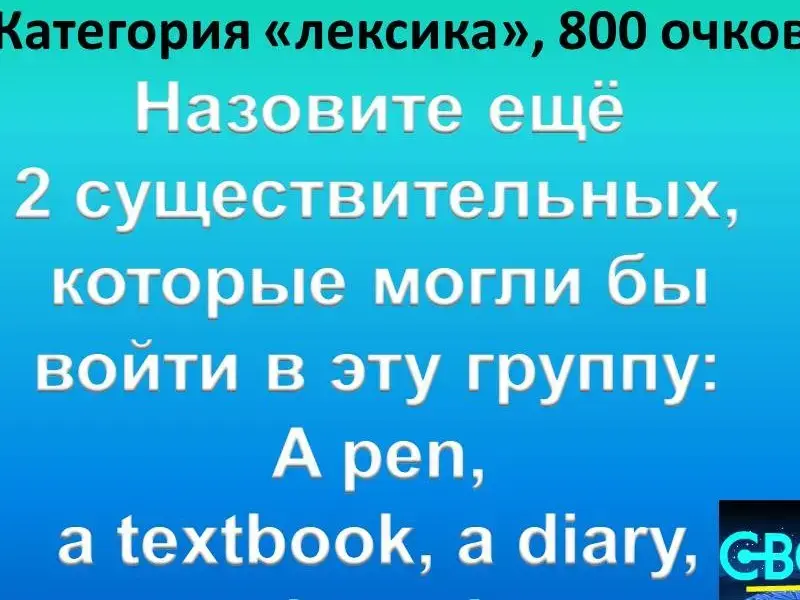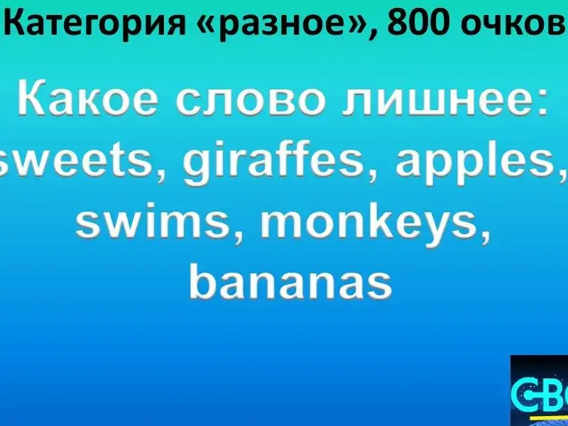 Questions of the second round: 1. Grammar 200. The driver ... his car every Monday. wash washes washing 2. Grammar 400. Какой вопрос был задан: Yes, this girl can play the guitar. 3. Grammar 600. Восстановите порядок слов в вопросительном предложении:Ben on Where swim does Fridays? 4. Grammar 800. Задайте общий вопрос к предложению: Mike plays football on Wednesdays. 5. Grammar 1000. Задайте специальный вопрос с вопросительным словом where: Kate spends winter holidays in France every year. 6. Lexis 200. This is a bird, it can run very well, but it cannot fly, it has got strong and long legs and a long neck. What bird is it? 7. Lexis 400. This animal can jump very well. It has got strong legs and long ears. It lives in Australia. What animal is it? 8. Lexis 600. This animal runs and jumps well. It is brown and grey. Scientists say that people are their distant relatives. They like bananas. 9. Lexis 800. Назовите ещё 2 существительных, которые могли бы войти в эту группу: a pen, a textbook, a diary, a board... 10. Lexis 1000. "Кот в мешке" - "а pig in a poke". This person helps all people. He cares about our health. He works in a hospital. Who is he? 11. Different 200. Продолжите ряд слов: arms, feet, a head ... 12. Different 400. Auction. Исправьте ошибки: Jane like to ride horse. 13. Different 600. Найдите лишнее слово: bread, butter, juice, a sandwich, cream. 14. Different 800. Какое слово лишнее: sweets, giraffes, apples, swims, monkeys, bananas . 15. Different 1000. John is my mother's brother. This girl is his daughter. So she is my...