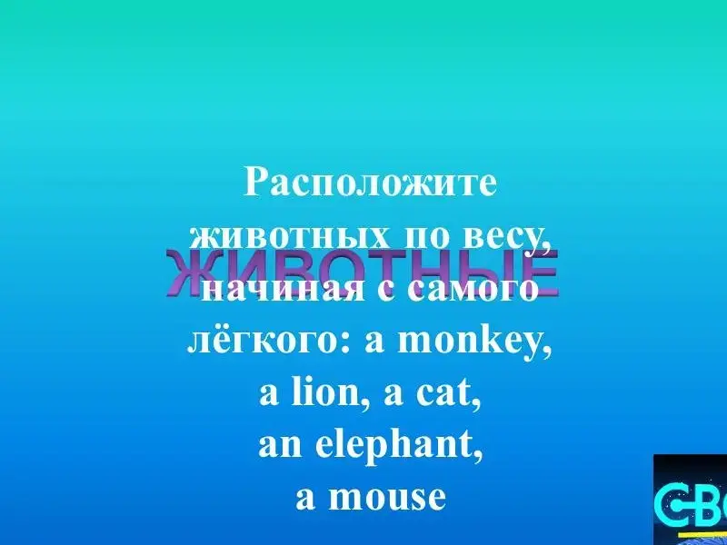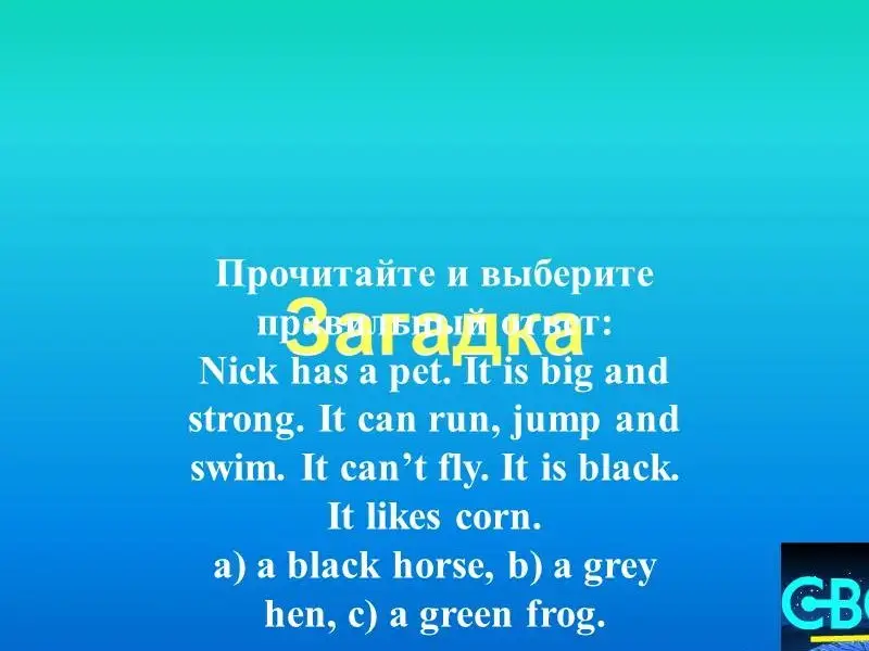 1. Загадка. У Ника есть домашний питомец. Он большой и сильный. Он умеет бегать, прыгать и плавать. Он любит кукурузу. а) чёрный конь, б) серая курочка, с) зелёная лягушка. 2. Цвета: красный,..., жёлтый,..., голубой, синий,... 3. Животные. Обезьяна, лев, кошка, слон, мышь. 4. Природа. A river, a lake, a mountain, a forest, a park. 5. Общие вопросы. - Да. Она любит прыгать на скакалке. 6. Специальные вопросы. Мэри проводит летние каникулы в Лондоне каждый год. 7. Числительные. Одиннадцать, двадцать два, тридцать три... |