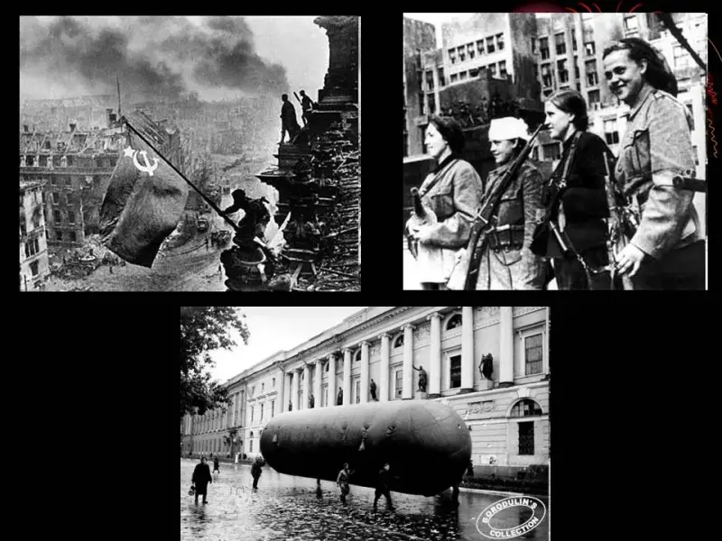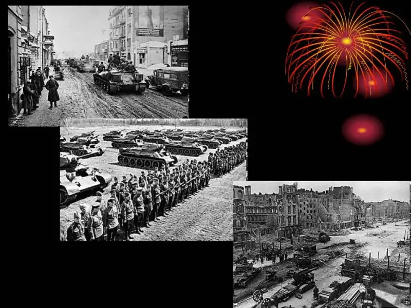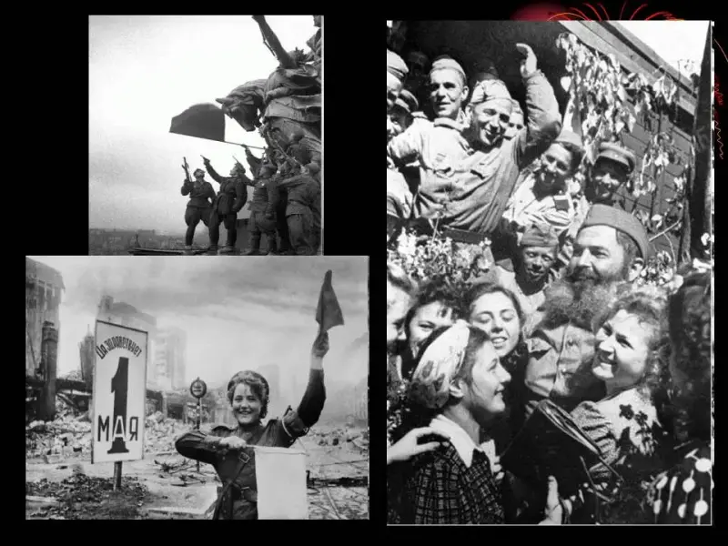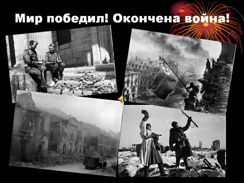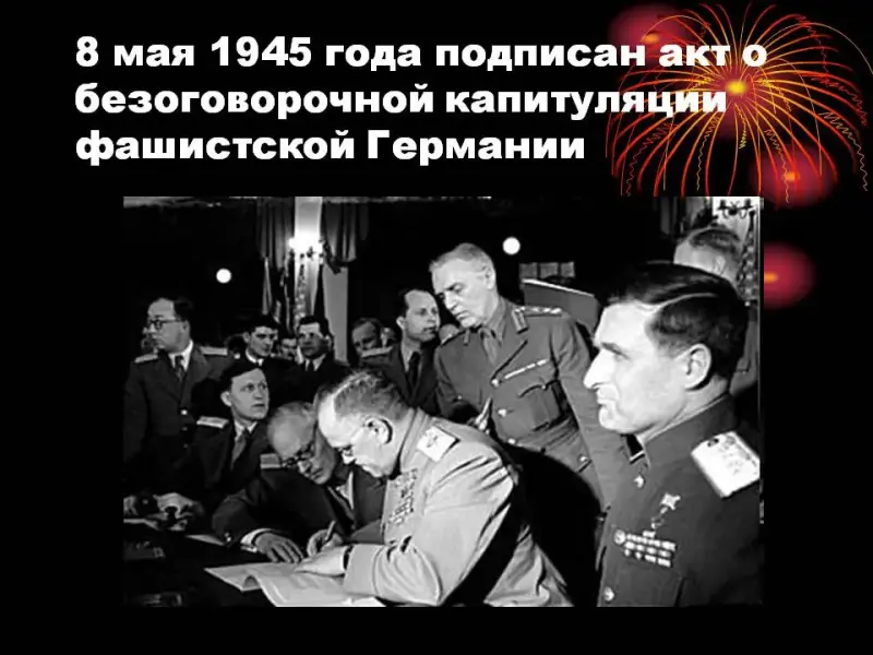 Ведущий. 8мая в городе Потсдаме был подписан акт о безоговорочной капитуляции фашистской Германии. Мир победил! Закончена война! (Слайды 26, 27)