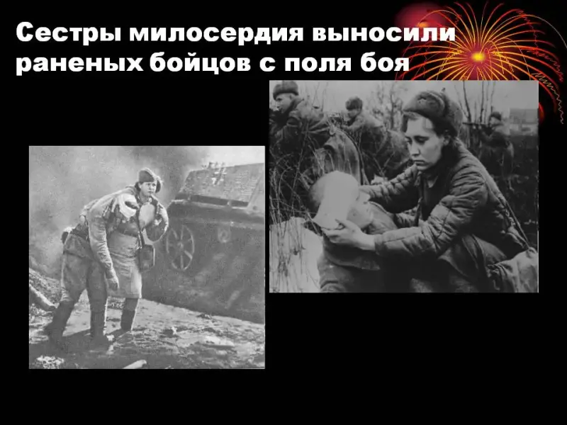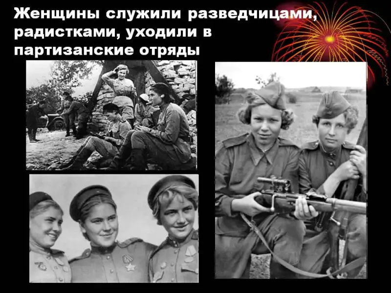 Ведущий: (Слайды 11, 12) Сёстры милосердия выносили раненых с поля боя. Женщины служили разведчицами, радистками, уходили в партизанские отряды.